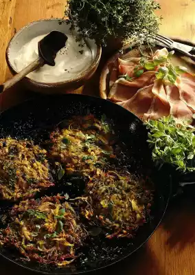 Mix half of the vegetables with thyme, the rest with marjoram. Fry in hot oil at medium heat for 3-4 minutes on each side in portions. Stir the crème fraîche and lime juice until smooth and serve with the ham to the potato pancakes.