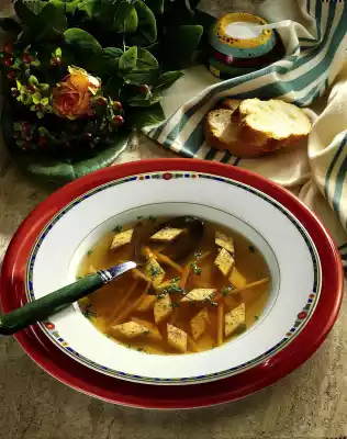 Turn out the eggs from the mould, cut into rhombuses and add to the stock. Wash parsley, dab dry and chop finely. Arrange soup in deep plates and serve sprinkled with parsley.
