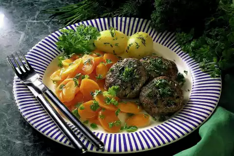 Stir with granulated stock. Mix carrots with chervil and arrange on a plate together with the meatballs and potatoes. Pour stock over the carrots and potatoes. Sprinkle the meatballs with the remaining herbs.