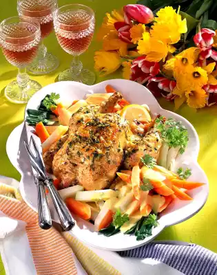 Wash parsley, dab dry and chop. Mix lemon juice, lemon peel, garlic and parsley. Whip the oil into the mixture. During the last approx. 30 minutes of frying time, brush the chicken with it several times. Clean, peel and cut the kohlrabi and carrots into sticks. Cover and cook in 1/4 litre boiling salted water for about 12 minutes. Clean, wash and halve spring onions, add to vegetables after about 7 minutes and cook. Then drain and store the stock. For the sauce, pour 1/8 litre warm vegetable stock into a pot. Stir in sauce powder and bring to the boil. Whisk butter in flakes over low heat and gradually add the sauce.