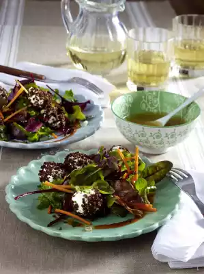Caramelise 1 tablespoon sugar and 1 tablespoon water in a pot for 3-4 minutes, deglaze with orange juice and simmer for about 8 minutes. Remove from the heat and let it cool down. Peel, wash and cut the carrots into thirds and cut into fine strips. Clean, wash and drain the salad well. Mix reduced orange juice, vinegar, honey, salt and pepper and gradually add oil. Mix salad and carrots in a bowl and drizzle with some orange vinaigrette. Arrange the carrot sauce on 4 plates, arrange the salad on top and add four cheese balls to each plate. Add the rest of the vinaigrette