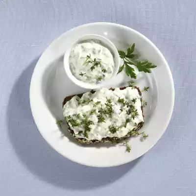 Spread bread with curd cheese. Fill the remaining quark into a small bowl. Cut the remaining cress from the bed and sprinkle it on the quark.