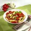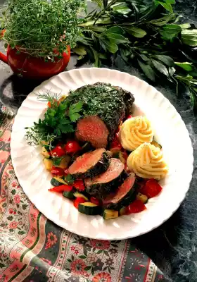 Wash herbs. Put something aside for garnishing. Finely chop the rest. Rub the fillet with salt, pepper and the herbs. Wrap in foil and cook in the preheated oven (electric cooker: 200 °C/ gas: level 3) for about 30 minutes. Clean, wash and chop the tomatoes and zucchini. Heat the oil in a pan and fry the vegetables for about 5 minutes. Season with salt and pepper. Bring 1/4 litre water and milk to the boil. Stir in the mashed potato powder and whip vigorously for 1 minute. Season with salt and nutmeg. Pour into a piping bag with a large star-shaped spout. Remove the fillet, cut it open and arrange it on a plate with the vegetables. Spray mashed potatoes on top. Garnish with herbs