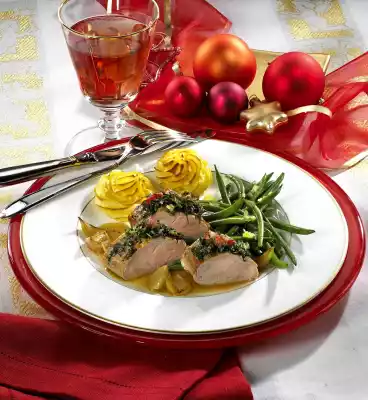 Wash, seed and dice the tomato. Wash and chop the parsley. Mix both with onion cubes and spread on the fillet. Spray puree as tuffs on baking paper. Bake both in a preheated oven (200 °C/ convection oven: 175 °C/gas: level 3) for 10-12 minutes