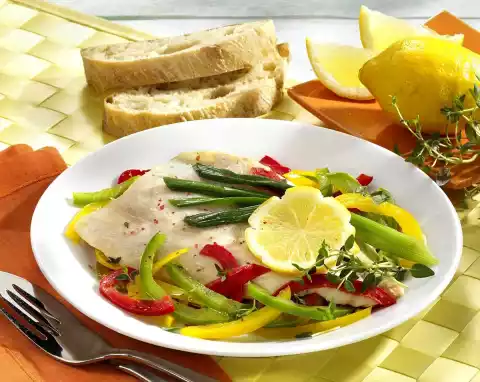 Put fish and vegetables on plates and garnish with thyme and lemon slices. Ciabatta tastes good with it.