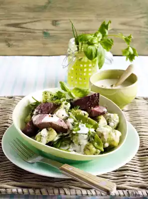 Clean, wash and chop the sugar snap peas. Heat 2 tablespoons of oil in a large frying pan, fry the sugar snap peas in it in two portions over medium heat while turning for about 3 minutes. Season with salt and pepper and remove. Remove meat from the oven, season with pepper and cover with aluminium foil. Heat 3 tablespoons of butter in a large pan and fry the gnocchi for 3-4 minutes, turning them over. Season with a little salt and pepper. Mix in sugar snap peas. Cut meat first into slices, then into strips. Arrange gnocchi with meat and sauce. Garnish with herbs set aside