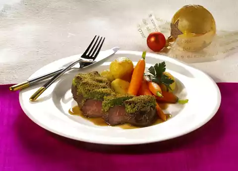 Spread the herb butter mixture on the lamb salmon. Remove the carrots from the water and keep warm. Cook the lamb under the grill for 4-5 minutes until the crust is lightly browned. Cover meat with aluminium foil and leave to rest for 5-7 minutes.