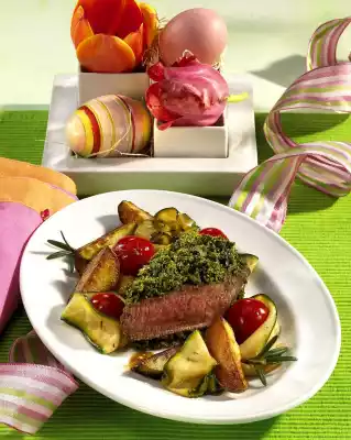 Add the zucchini and season with salt and pepper. Add vinegar and 100 ml water and bring to the boil. Take the meat out of the oven and let it rest for about 5 minutes. Arrange potatoes and vegetables on plates. Cut the saddle of lamb fillets and put them on the plates.
