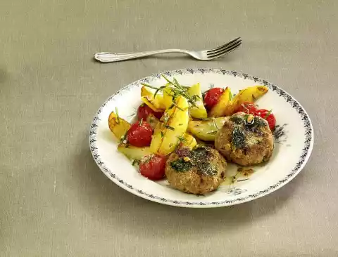Wash the tomatoes. 15 minutes before the end of the cooking time, pour rosemary over the potatoes, turn and add the tomatoes. Peel onion and dice very finely. Crumble the feta cheese very finely. Wash mint, shake dry, put some leaves aside. Cut remaining leaves into fine strips. Squeeze the bread. Knead mince, egg, onion, squeezed bread, mustard, mint strips and sheep's cheese. Season with salt, pepper, paprika and cumin. Form eight meatballs from the minced meat mixture, place mint leaves on the surfaces and press lightly.