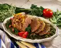 Wash the chervil and marjoram and dab dry. Pluck the marjoram leaves from the stalks. Sprinkle meatloaf with chervil and marjoram. Arrange on a plate with the braised vegetables and lemon slices.
