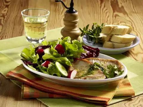 Melt butter in a clean pan, add parsley strips, lemon juice and zest. Arrange salad with radishes and cucumber, drizzle with vinaigrette. Serve the meat as well, sprinkle with parsley butter and garnish with parsley leaves.