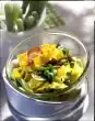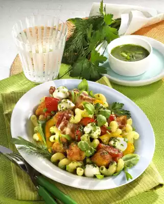 Drain the mozzarella. Mix all prepared ingredients. Wash herbs and chop coarsely. Puree the herbs, parmesan and olive oil. Season with salt and pepper and fold into the salad. Serve sprinkled with herbs