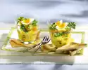 Heat 1 tablespoon of oil in an ovenproof pan and sauté the onions for about 3 minutes until translucent. Beat the eggs in a bowl and whisk. Season with salt and pepper. Add 3/4 of the tomatoes, chopped rocket, herbs and eggs to the pan and let it simmer in the preheated oven (electric cooker: 175 °C/ convection oven: 150 °C/ gas: level 2) for about 15 minutes.