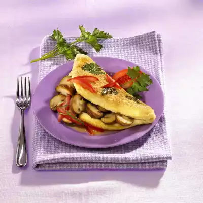 Cut the flesh into strips. Heat 1 teaspoon margarine in a pan. Fry the mushrooms for about 5 minutes. Season with salt and pepper. Add tomato strips. Deglaze with 100 ml water, stir in broth, bring to the boil briefly once. Cover half of the omelette with the mushroom mixture, fold the other half over. Sprinkle with parsley strips and garnish with parsley