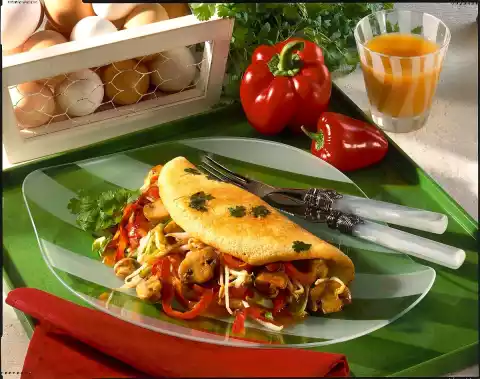 Pour the egg foam mixture into the pan, smooth it down, cover and bake at low heat for 15-20 minutes. In the meantime, clean, wash and drain the bell peppers and spring onion. Cut the spring onion into rings, the paprika halves into fine strips or plane them. Wash the sprouts and let them drain. Clean and halve the mushrooms. Heat the remaining fat in a pan and fry the mushrooms until golden brown. Add bell pepper, spring onion and sprouts, braise for 1-2 minutes and deglaze with approx. 4 tablespoons of water. Stir in Asian sweet and sour sauce and ketchup, bring to the boil and season with soy sauce, cayenne pepper and possibly a little salt. Slide the finished omelette onto a plate.