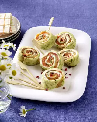 Mix sour cream with horseradish, season with salt and pepper. Spread the pancakes with horseradish sour cream. Spread salmon slices on top, roll up and cut into pieces of about 3 cm width. Add wooden skewers if necessary. Arrange on a plate and sprinkle with pink berries