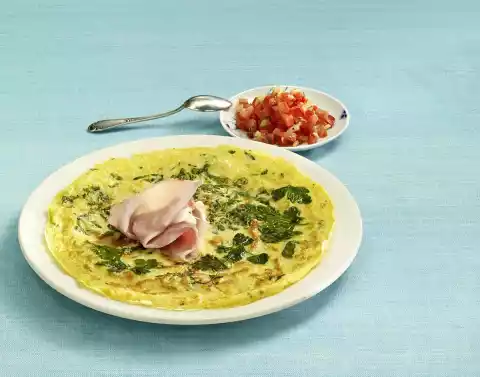 Wash thyme, shake dry, pluck leaves from the stalks. Wash basil, shake dry, put some leaves aside, cut remaining basil into strips. Stir the chopped herbs into the dough. Heat clarified butter in portions in a pan (approx. 28 cm Ø) and bake 4 pancakes one after the other turning them until golden brown. Add some parsley and basil leaves to the pan. Keep warm. Arrange one pancake each with 2 slices of ham on a plate. Add some extra salsa