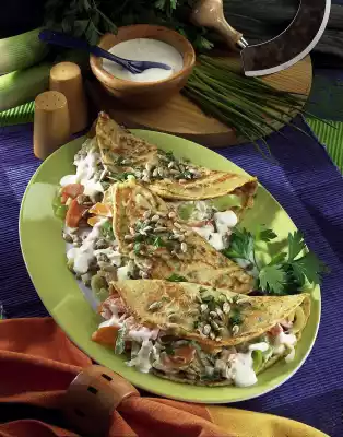 Chop parsley leaves, except for some for garnishing. Stir the sour cream into the vegetables. Season with salt and pepper. Fold in parsley. Fill pancakes with vegetables and arrange on a plate.