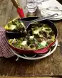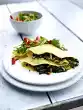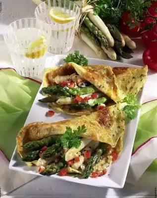 Bake 8 golden yellow pancakes one after the other. Lift the asparagus out of the water and let it drain. Fill the pancakes with asparagus, pour some vinaigrette over the asparagus and serve with pepper and chervil garnish as you like.