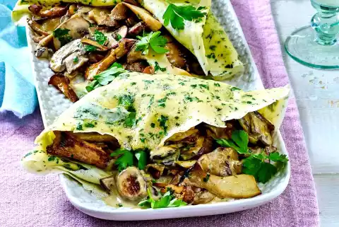 Fill the pancakes with mushroom ragout, place 2 on each plate and garnish with parsley.