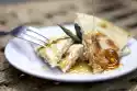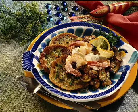 Stir crème fraîche until smooth and season with salt and pepper. Wash and slice the lemon. Arrange 3 pancakes each with 3 scampi and mushrooms on a plate. Put a dash of crème fraîche on top and serve garnished with lemon and other herbs.