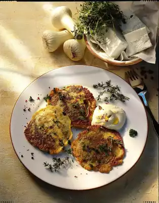 Peel the garlic. Puree the feta cheese, garlic and crème fraiche. Stir in olive oil. Season with salt and pepper. For the pancakes, wash the herbs, dab dry and chop.