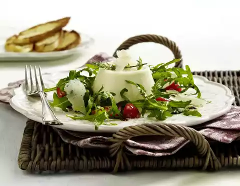 Clean the arugula, wash it. Wash and quarter the tomatoes. For the marinade, mix vinegar, salt, pepper and some sugar. Fold in the oil. Turn out the panna cotta onto plates. Arrange lettuce and tomatoes around it and sprinkle evenly with the marinade.