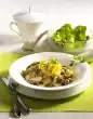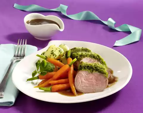 Heat 1 tablespoon of oil in a frying pan and fry the fillets all around for about 3 minutes, then place on a baking tray. Spread the herb mixture on the fillets and press them a little bit firmly. Cook the fillets in a preheated oven (electric cooker: 200 °C/ convection oven: 175 °C/ gas: level 3) for 15-18 minutes, then remove and leave to rest covered for 5 minutes. Pour 200 ml stock and wine into the roasting set and start cooking. Let the sauce simmer for about 5 minutes. Season to taste with salt and pepper and thicken with sauce thickener. Chop the leaves of 2 stems of parsley finely. Clean the carrots and blanch in salted water for about 3 minutes, then rinse with cold water. Wipe skin with a damp cloth. Cook the dumplings in boiling water for about 7 minutes. Caramelise the sugar in a pan. Add 1 tablespoon of butter and 1 teaspoon of water and boil caramel loose.