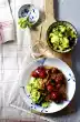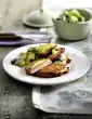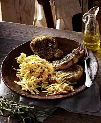 Heat 1 tablespoon of oil in a large frying pan. Fry the steaks in it over medium heat (so that the herbs do not burn) for about 5 minutes on each side. Deglaze with lemon juice. Arrange steaks and salad.