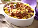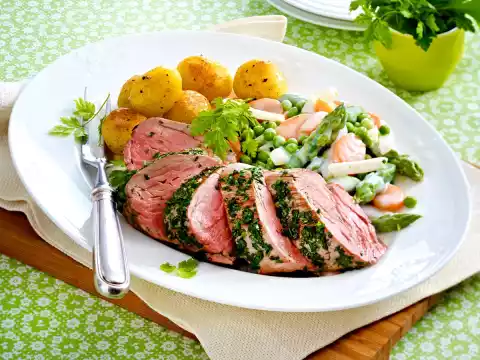 Drain the potatoes and let them evaporate briefly. Heat the meat again. Fry the potatoes for 5-6 minutes, turning them, and season with salt and pepper. Wash the herbs and shake dry. Put something aside for garnishing. Pluck the remaining leaves from the stems and chop finely. Heat 2 tablespoons of oil in a frying pan and remove from heat. Add the herbs and braise for about 1/2 minute. Remove meat and turn in the herbs. Boil up the Leipziger Allerlei. Cut meat into slices, arrange with potatoes and Leipziger Allerlei, garnish with remaining herbs