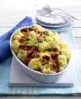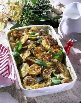 Peel the garlic and press it through the garlic press. Bring cream, milk, garlic and dried herbs to the boil. Season and pour over the potatoes. Bake in the preheated oven (electric cooker: 200 °C/ circulating air: 175 °C / gas: level 3) for approx. 50 minutes