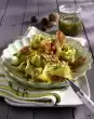 Press the dough and use a ruler and dough wheel to make small squares. Bring a large pot of salted water to the boil, add a little oil and cook the herb ravioli for 3-5 minutes. Drain the ravioli on a sieve and rinse with cold water.