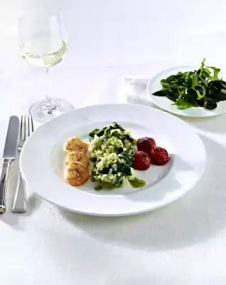 Arrange the risotto, tomatoes and prawns on 4 plates, drizzling the remaining herb oil over the risotto. Mix salad and vinaigrette and add