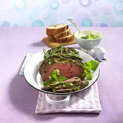 Pre-cook in the preheated oven (electric cooker: 225 °C/ convection oven: 200 °C/ gas: level 4) for approx. 15 minutes. Reduce temperature to 100 °C and cook for a further 3 hours. Clean and wash spring onion and cut into fine rings. Puree remaining chopped herbs, spring onion and yoghurt. Mix with mayonnaise. Season to taste with salt, pepper and lemon juice. Whip the roast beef in aluminium foil, let it rest for about 10 minutes. Then cut open and garnish with fresh herbs. Serve yoghurt and herb sauce extra.