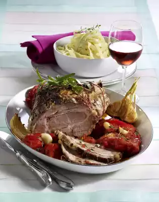 Place the roast on the fat pan of the oven. Roast in the preheated oven (electric cooker: 175 °C/ convection oven: 150 °C/ gas: level 2) for approx. 1 3/4 hours. In the meantime clean, wash and halve the tomatoes.