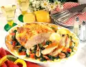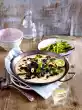 Cook the pasta in boiling salted water according to the instructions on the packet. Remove roast from the oven, garnish with remaining herbs, cut open. Arrange on a plate with tomatoes, garlic, onions and stock.