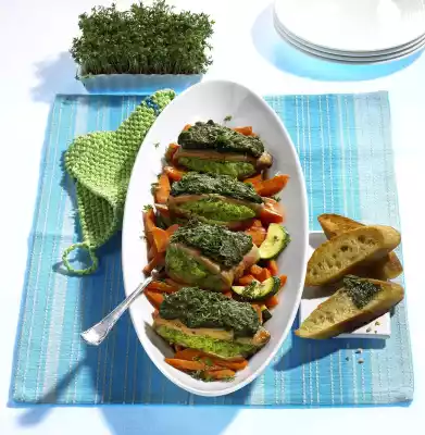 Spread with herb mixture and place on a greased fat pan of the oven. Bake in the preheated oven (electric cooker: 225 °C/ convection oven: 200 °C/ gas: level 4) for about 25 minutes. After 10 minutes add the stock. In the meantime clean and wash the vegetables. Peel carrots, cut them in half lengthwise and cut them into diagonal pieces. Halve the zucchini lengthwise and cut them diagonally into pieces. Heat oil in a pan and fry vegetables for about 10 minutes. Season with salt and pepper. Arrange vegetables on a plate and sprinkle with remaining cress. Put the cutlets on top. Roasted bread tastes good with it