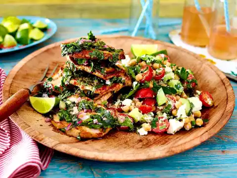Drain the chickpeas, rinse with cold water and drain. Wash the cucumber thoroughly, cut it in half lengthwise, remove the seeds and dice. Wash and halve the tomatoes. Crumble feta. Wash half the parsley, shake dry and chop. Mix 3 tbsp. oil and 3 tbsp. lime juice. Season with salt and pepper. Mix the salad ingredients with the marinade.