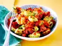 Wash the basil, mint, rocket and remaining parsley, shake dry. Peel onion and garlic. Clean the chilli, cut lengthwise, remove seeds and wash. Chop everything finely, mix with 2 tbsp. oil and 3 tbsp. lime juice. Season with salt and pepper.