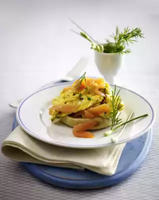 Cut salmon into strips. Arrange the scrambled eggs and salmon on the toast and garnish with the rest of the herbs.