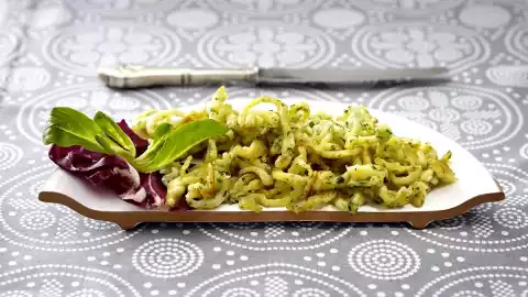 Mix flour, eggs, 1/2 teaspoon salt and 75 ml water with the dough hooks of the mixer to a thick dough. Add herbs. Beat the dough with a wooden spoon until it bubbles. Place portions into a spaetzle press and press into boiling water.