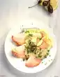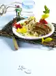 Mix flour, eggs, 1⁄2 TL salt and 75 ml water with the dough hooks of the mixer to a thick dough. Add herbs. Beat the dough with a wooden spoon until it throws bubbles. Place the dough in a spaetzle press in portions and press into boiling water. Cook until the spaetzle rise to the surface, then lift them out and let them drain well