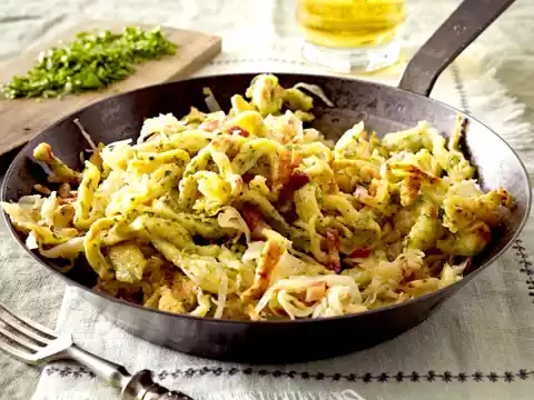 Heat butter in a large frying pan. Fry the spaetzle for about 10 minutes while turning. Stir the sour cream into the sauerkraut. Season to taste with salt, pepper, 1 pinch of sugar and possibly caraway. Fold the sauerkraut into the spaetzle and serve.