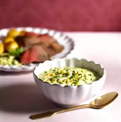 Finely dice the cucumber. Wash and shake the herbs and add them to the sauce. Stir everything into the mayonnaise. Finely dice remaining egg white and egg. Goes well 1 x lengthwise and 1 x crosswise in the egg cut. Stir into the sauce. Flavour with salt, pepper and cucumber water. Goes well with roast beef, smoked pork, fried fish etc.