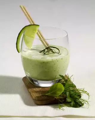 Wash the herbs, pluck roughly, put a little aside for garnishing. Put the rest of the herbs into a mixing cup. Wash the cucumber, cut off 1 thin slice and cut in half. Put one half aside.