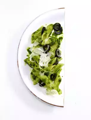 Drain the pasta and mix with pesto and olives. Sprinkle with parmesan
