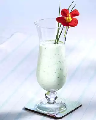 Pour the drink into 4 glasses and garnish each with 3 chives and 1 nasturtium flower.