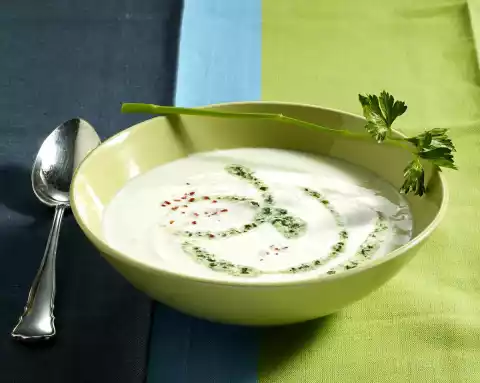 Puree the herbs and 3 tablespoons of yoghurt milk with a hand blender. Put the yoghurt milk in a plate. Add herbal yoghurt with a spoon in streaks and sprinkle with chilli flakes. Garnish soup with a parsley stalk.