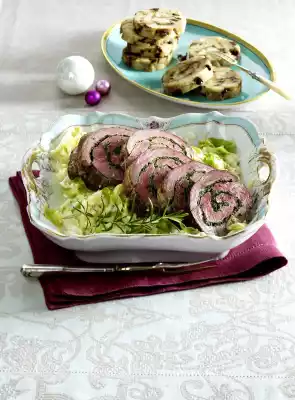 Wrap napkin dumplings from the cloth and cut into slices. Loosen kitchen thread from the roulade and cut the roulade into slices. Arrange the meat on the pointed cabbage and sprinkle with fresh horseradish.