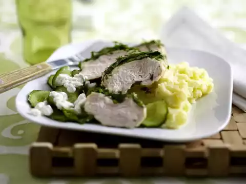 Roughly chop the herbs and spread them on a flat tray. Drain the potatoes in a sieve. Heat milk in the pot, add potatoes and yoghurt, mash to puree and season to taste with salt. Cover the puree and keep warm.